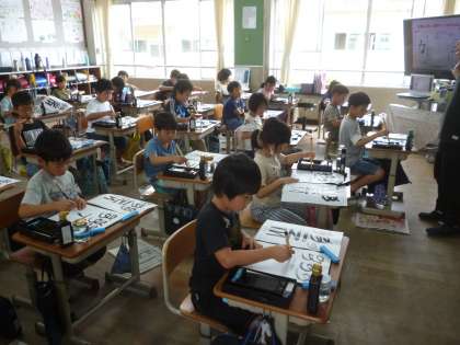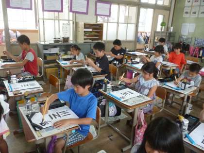 3年生になり,書写の毛筆学習が始まりました。はじめは,毛筆で使う用具や,準備片付けの仕方を学習しました。そして,いろいろな線を筆で書きました。硬筆とは違って,字の太さを変えられるところなどを感じることができました。とても緊張して書いているようでしたが,「よい姿勢」や「静かな心」で書くことができました。