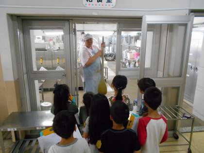 給食室では,食材や調理道具について質問しました。