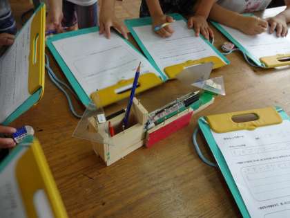 小物も置ける鉛筆立てや,触りたくなるマッサージ機など,思いの詰まった作品をみながら友だちの作品のよさを見つけていました。