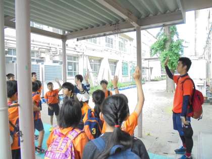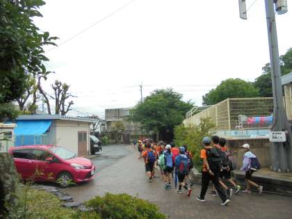 タグラグビー部が,宝ヶ池で行われるトリコロールカップにむけて学校を出発しました。「学校から一歩外に出たら,音羽小学校の代表としてしっかりした態度でがんばってください。公共の乗り物でもマナーを守ってください。」と話しました。「はい!」と返事して並んで行くうしろ姿に頼もしさを感じました。けがのないように,安全に…。