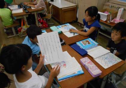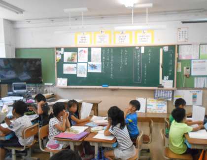 子どもたちの待ちに待ったスイミーの学習がはじまり,楽しく学習しています。今日は,みんなでお話を読み,感想をグループで交流しました。グループで司会者を決め,スムーズに交流することができました!!