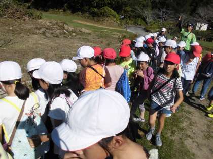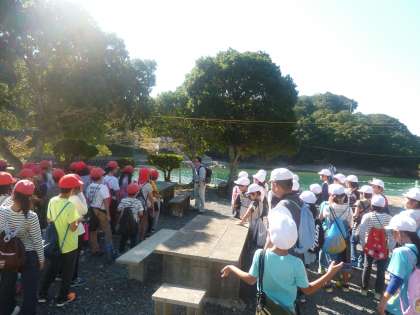 小さな川の所にカニがたくさんおり,びっくりしている子どもたちです。