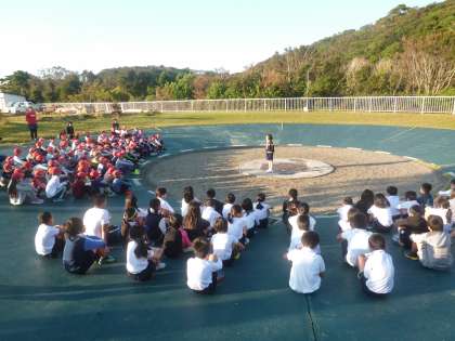 朝1番の活動は桃山小学校と合同で朝の集いを行いました。