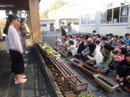 秋晴れのよい天気が続きます。6年生に引き続き,5年生も園芸委員会が企画した「花いっぱい運動」を中間休みに行いました。行いました。植えた後の世話もがんばってほしいと思います。