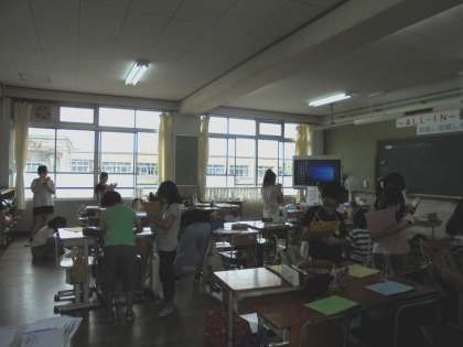 5年生の教室。全員で学習に取り組む姿です。1組は作品鑑賞の時間でした。