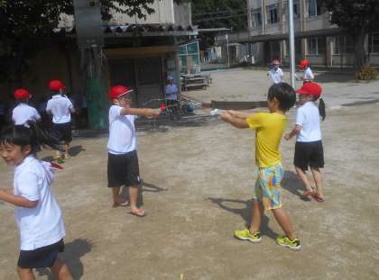 生活の学習で,夏にできる遊びをしました。身近にあるもので,友達を水をかけたり,どこまで飛ばせるかを競ったり,楽しく活動できました!