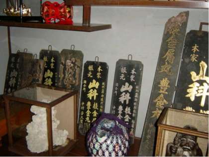 明治の始め頃まで山科で売られていました有名な「牛尾山大蛇退治」の伝承があります。1313(正和2)年7月3日に,醍醐山から牛尾山の蛇ケ淵に数十丈(1丈は約3メートル)の大蛇がやってきて,牛尾観音の参拝の人もなくなってしまいました。そこで,小山の里に内海浪介景忠という弓矢の得意な武士がいて,これを退治に行きました。大蛇の様子を伺うと,大蛇はすやすやと眠っていたので,これはちょうど良いと思って,持っている弓に矢をつがえて,キリキリとひきしぼり,ヒューっと放つと,みごとに大蛇の首を射抜きました。大蛇はびっくりして,「蛇ケ淵」に退いて,あたりを睨みつけます。そのすきに,景忠が再び矢を放つと,今度は大蛇のまっただ中を射通しました。大蛇は激しく暴れ回りましたが,景忠は山腹に回り込み,大盤の石を投げつけると,ついに大蛇は死んでしまったのです。しかし,景忠は大蛇のうろこの毒にあたり,高熱が出て死にかけてしまいました。その時,どこからか仙人が現れて,景忠のために秘薬をつくってくれました。そのおかげで景忠は助かることができたのです。この秘薬は「ためし金しょう丸(がん)」と言って,内海家のみに作り方が伝わっていましたが,やがて山科の各地に伝わり,明治のはじめ頃まで御陵の「すずめ坂」あたりで旅人たちに販売されていました(写真は,今に伝えられている由緒・製法を記した書き物と,売られていたお店の看板です)