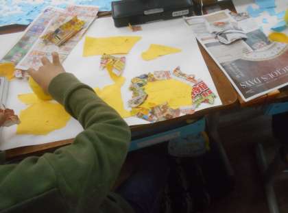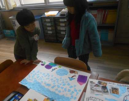 図画工作科では,やぶったり,ちぎったりしてできた形からどんなものに見えるのかをお友達と話しながら絵に表しました。