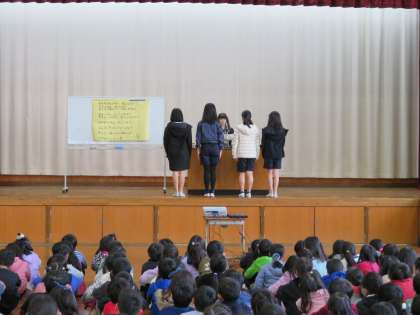 3日(月)に朝会がありました。校長先生からは,「時間を大切にしよう」「将来の夢・なりたい自分をイメージしよう」「今できることからはじめよう」という3点についてお話がありました。学年末が近づいてきました。それぞれの目標に向かって頑張ってほしいと思います。トイ・コンテストをはじめ書写,読書感想文,茶道,タグラグビーなど各種さまざまな表彰がありました。