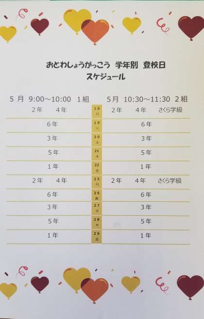 登校は任意です。もちもの:健康観察票 学習課題 筆記用具 ぼうし すいとう (登校する際には,マスク着用の徹底を図りたいと思いますので,ご協力をよろしくお願いいたします。)1年生については,登下校の際に保護者の方の随行をお願いします。