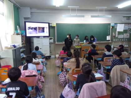 初めに,教室で画像などを見ながら,避難経路の説明を聞きました。その後,地震を想定した避難訓練をしました。