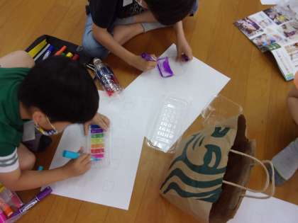 たくさんご用意して頂いた透明の材料を使って作品を作りました。思い思いの色を塗り,雲の合間の晴れ間を狙って光を透かしたり,床や地面に映したりして楽しみました。塗ったものを回転させたり,友達のものと重ねたりして映る色や形の変化にも気づきました。