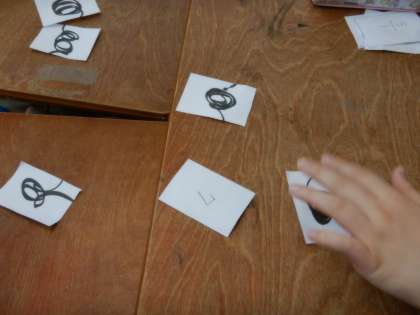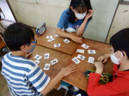 今日はお互いにかけて1になる分数を探しました。かけ算のしかたが理解できていると,分母と分子を入れ替えた数だ!とピンときたようです。そのような数を逆数ということを知り,整数や小数でも,分数に置き換えると逆数を見つけることができました。最後は逆数同士をめくって積が1になる数を探す,逆数神経衰弱をしました。