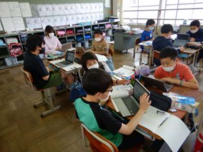 社会では,東日本大震災からどのように復興したのかを学習しています。今日は,復興や復旧に向けて,国はどんな取り組みをしたのかを班で協力しながら,教科書や資料集,タブレットを使って調べました。予想で上がっていた,予算やライフラインについての取り組みが出てきていました。
