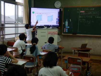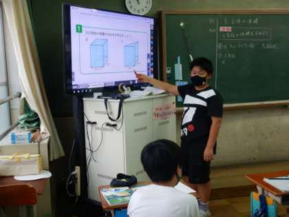 今までの学習で,直方体と立方体の体積を求める学習をしてきました。6年生では,角柱や円柱の体積を求める方法を考えます。今日は三角柱の体積の求め方を考えました。直方体の体積をもとにして,それの半分という考え方や,底面積を積み上げるという考え方で答えを求めていました。