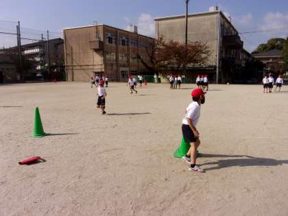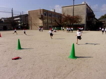 今日からリレーあそびが始まりました。バトンリレーではなく,地面に置いた輪に入ることで,次の走者がスタートするという形式でした。コースの折り返し地点のコーナリングや,コーンを避けて走る身のこなし方も工夫しました。
