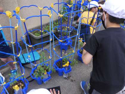 2年生活科「ぐんぐんそだて」でトマトのかんさつを続けています。一か月経ち,だいぶトマトが大きくなってきました!実ができてる!といった声も聞かれました!これから他の野菜とともにしっかり育てていきたいと思います!