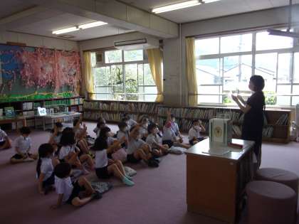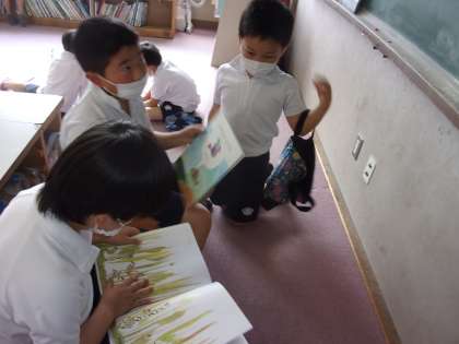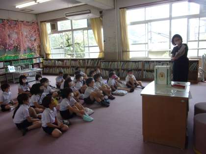 2年国語科「スイミー」〜図書の先生のブックトークの様子です。図書司書の先生の話を真剣に聞く子どもたちです。そのあと,自分たちで本も読みました!