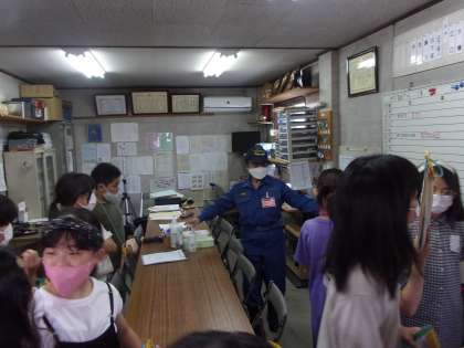 消防分団の方々から災害時に使う道具について説明していただきました。実際に触ったり、身に付けたりして子ども達は興味津々でした。