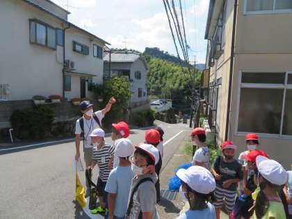 前回考えた「音羽のまちってどんな町?」のイメージを確かめるべく、町探検に出発しました。子どもたちの希望に合わせて2コースに分かれました。1号線・音羽病院・音羽中学校などを通るコースと、四ノ宮商店街、疎水、小金塚、旧三条通などを通るコースです。