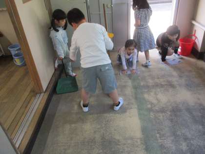 ほうきやぞうきんを使って、隅から隅まできれいにしています。