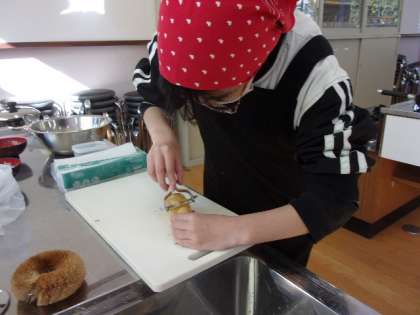 煮干しのだしを取って、みそ汁を作りました。皮むきや包丁を使うときは、手を切らないように気をつけながらしました。火をつけてコトコト煮ているうちに、だしのいい香りがすると、「いい匂い、早く食べたい。」と言ってつくっていました。初めてつくったみそ汁がとても美味しくておかわりするほど大満足の味になりました。