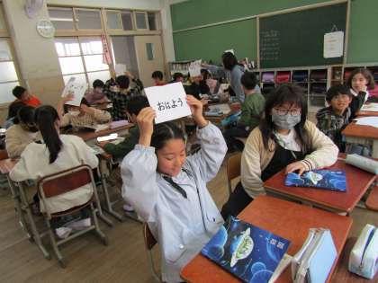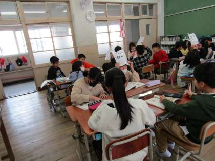 国語科「ひみつの言葉を引き出そう」の様子です。グループの一人が頭の上に言葉をかかげ、その言葉を周りの人が引き出すというものです。「カレーライスを食べた時にどう思う?」「朝教室に来て言う言葉は何?」など、それぞれ工夫しながら取り組んでいました。5年生の国語の学習、楽しみながら取り組めたらいいなと思います!!