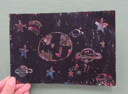 カラフルに色をつけた上から黒色で塗りつぶし割りばしで削って模様を描いたり、ティッシュでこすったりしながらグラデーションを表現したりする姿が見られました。