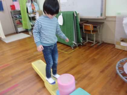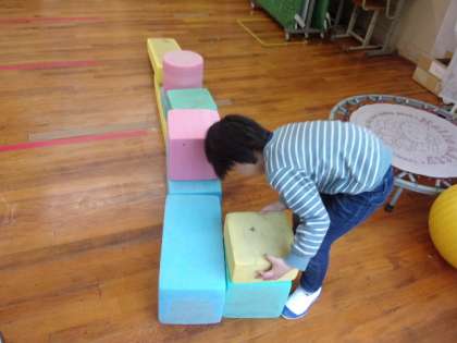 大型積み木を組み立てました。「ぐらぐらしたらあぶないから・・・。」と形を選んで作っていました。最後に端から端まで渡ってゴールすることができました。
