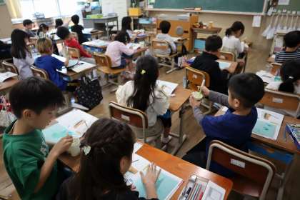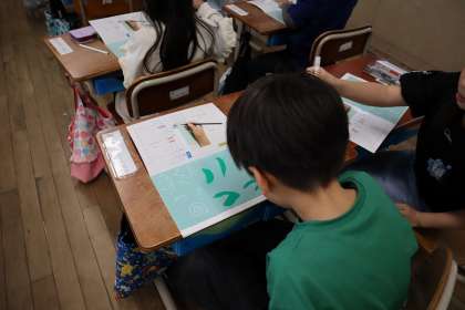 その際に水書用筆を使って、払いや止めの練習をしました。