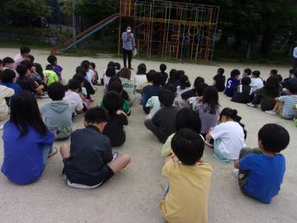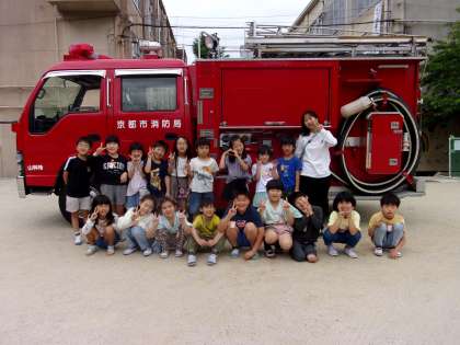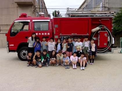 運動場に出て、校長先生や消防士さんの話を聞いた後、みんなで消防車の前で写真を撮りました。