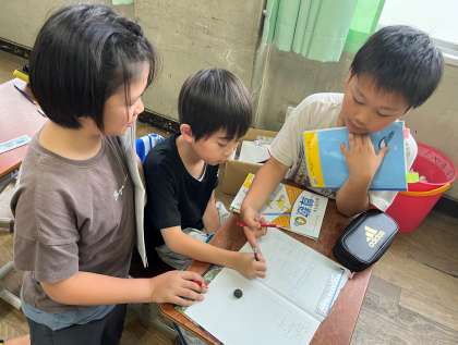 難しい問題ではミニ先生が活躍し、教え合いをしています。答えではなく計算の手順や考え方について説明しています。