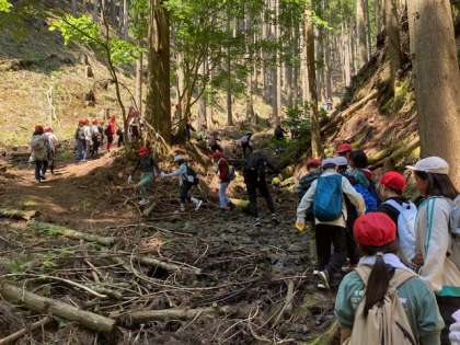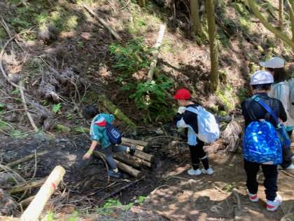 途中には小川が流れていて、丸太や岩の上を渡るところがあります。