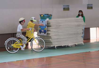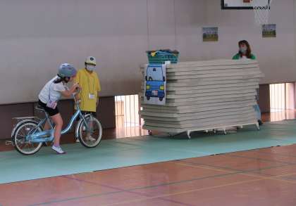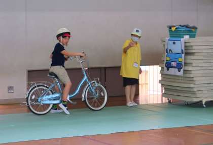 コースの最初のポイントは、車に見立てたマットの近くを安全に走行することができるのか、でした。