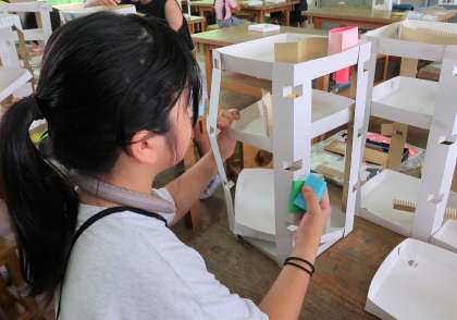 箱を立体的に組み立て、ビー玉を転がしながら動く様子を楽しみました。