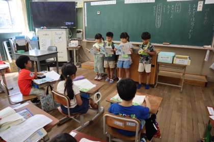 黄のあおむし・ピンクのあおむし・緑のあおむし・大きな木の中から、自分がなりたい役を決めて、音読発表会を行いました。その時の気持ちに応じて、音読の仕方を変えることができました。