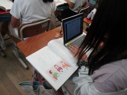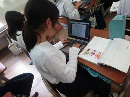 5年生はタイピングを強化するためにタイピング練習の時間を取っています。国語の教科書の物語文や説明文を時間内にどれだけ打てるのか練習しています。少しずつ打てる量が増えてきて嬉しそうです。