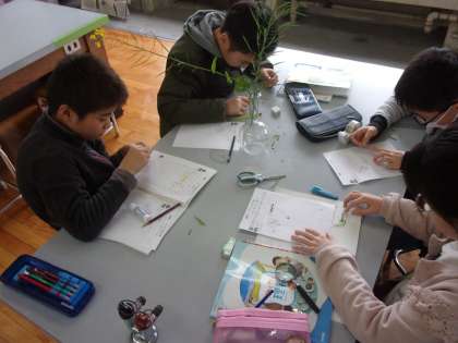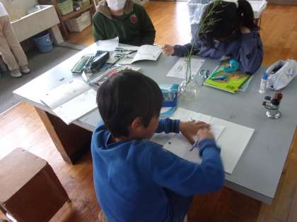 理科では、花が咲いた後、実がどのようにしてできるのかを考えました。アブラナの花がさいた後、めしべのもとのふくらんだ部分が育って、実になることや実の中には、たくさんの種子ができていることに気がついていました。