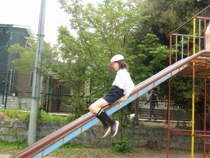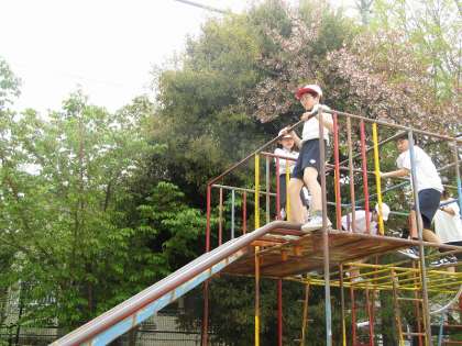 今日は50メートル走を走った後に総合遊具に登りました。高学年になると総合遊具に登る人も減ってくるので久しぶりに登った人もいました。安全な登り方を確認して、3段目まで登り、滑り台で滑っておりました。「こんなに高かったっけ?」「滑り台意外と速い!」と久々の総合遊具を楽しんでいました。