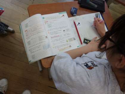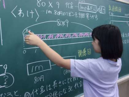 今日は、比例していることを使って、求める式のわけを説明する学習をしました。既習の図に加えて、数直線図も習い、説明する幅が増えました。ペアでよく話しあえていました。