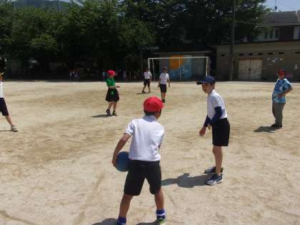 遊び係です。現在、遊び係の遊びを考案中です。その名もタッチフット。タグラグビーのタグを取るのではなく、タッチするバージョン。結構楽しいみたいです。
