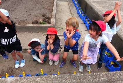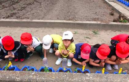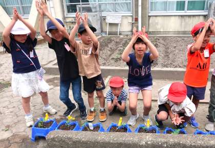 「大きなトマトがなりますように」「ぐんぐん大きくなあれ」「大事に育てるからね」などと言いながらおまじないをかけました♪