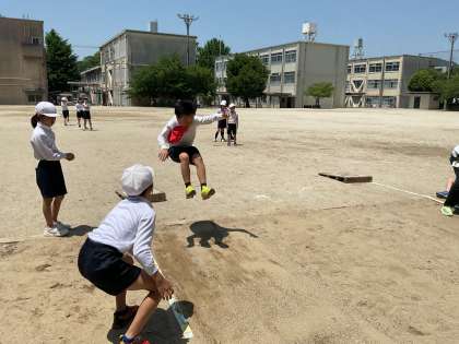 踏切りゾーンに足が合うように助走して跳んだり、高く跳ぶことを意識して行ったりすることができました。少しでも遠くに着地できたときは、とてもうれしそうでした。