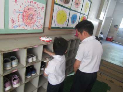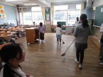 掃除時間の様子です。開始時間ぴったりに始めて、素早く掃除しています。1年生にも優しく教えている様子が素敵です!