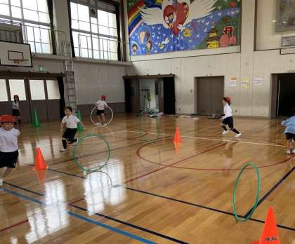 フープをまわしたり、転がして受け取ったりする遊びを進めています。