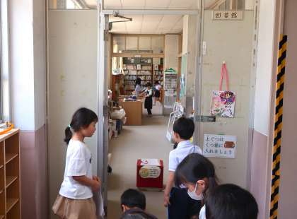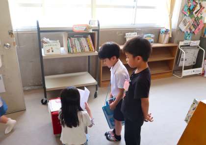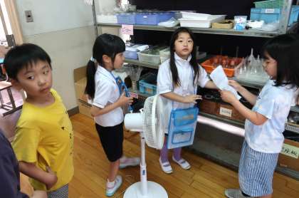 理科室では、たくさんの実験道具や模型に興味を持って見ていました。
