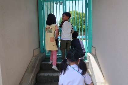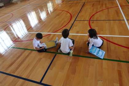 体育館では、体育で使う道具や学習の内容について詳しく説明していました。