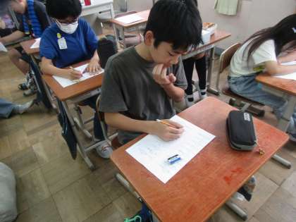 5時間目が始まる前の15分間はぐんぐんタイムです。今はこの時間に漢字50問テストの勉強をしています。「心臓」「時刻」の字が難しかったようで、みんなで間違えやすいポイントを確認しました。100点を目指して頑張れー!!