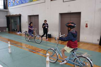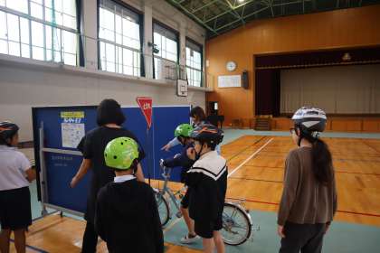 もう1時間は、体育館で実際に自転車に乗り、交通ルールを確認しました。止まれの標識を意識したり、道路のどこを走るのか確認したりすることができました。