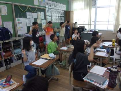 世界で使われているジェスチャーについて学習しました。体を楽しそうに動かして、学習していました。